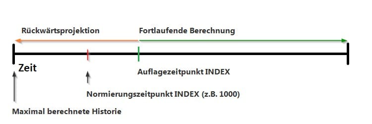 Sind alle Komponenten eines Aktienindexes ausgesucht, muss er berechnet werden. Dazu wird ein Startdatum (Normierungszeitpunkt) festgelegt. Auf dessen Basis werden alle folgenden Berechnungen aufgebaut. Das Datum kann dabei auch in der Vergangenheit liegen.
