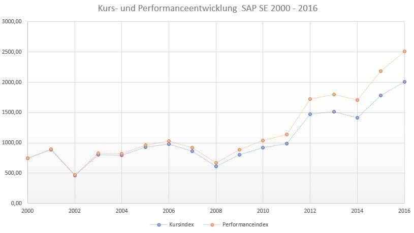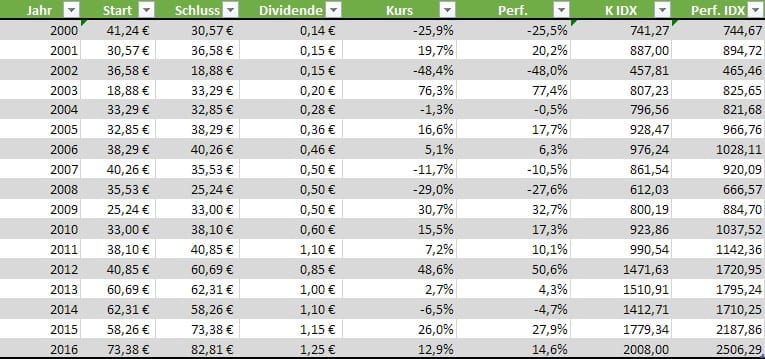 Ende 2000 ist der Kurs der Aktie also um -25,9% gefallen. Dank gezahlter Dividende von 0,14 Euro pro Aktie ist die Performance allerdings nicht ganz so desaströs: Der Performanceindex hat einen Drawdown von „nur“ -25,5%. Also 0,4 Prozentpunkte weniger.