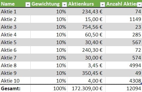 In dem Bild wurde die Summe der Aktienkurse mit 100 multipliziert, damit eine passende Anzahl an Aktien für die Gleichgewichtung gekauft werden kann.