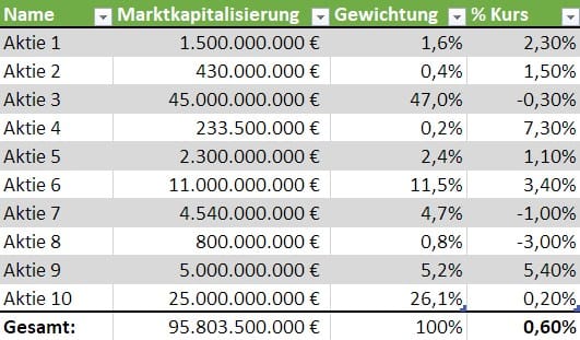 Die Unternehmen haben jeweils eine unterschiedliche Marktkapitalisierung. Alleine Aktie 3 hat dabei eine Gewichtung von 47%. Durch sie wird die Gesamtperformance des Index (0,60%, siehe untere Zeile letzte Spalte) nach unten gezogen. Wäre Aktie 4 besser kapitalisiert, dann hätte die Kursentwicklung von 7,30% einen stärkeren Einfluss auf den Index. Aber sie spielt kaum eine Rolle bei der Berechnung (Nur 0,2%).