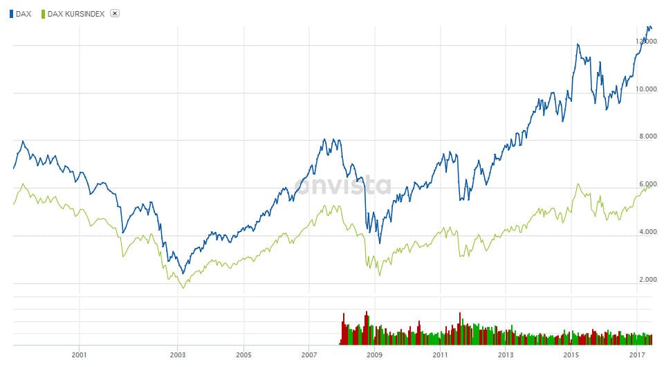 Der DAX wird klassischerweise als Performanceindex dargestellt. Unten sieht man die Entwicklung von DAX KURS (liegt ca. bei 6.000 Punkten) und DAX PERFORMANCE (liegt ca. bei 12.500 Punkten). Hier sieht man: Seit Anfang 2000 waren 50 Prozent der Kursentwicklung des DAX durch die Ausschüttung von Dividenden begründet.