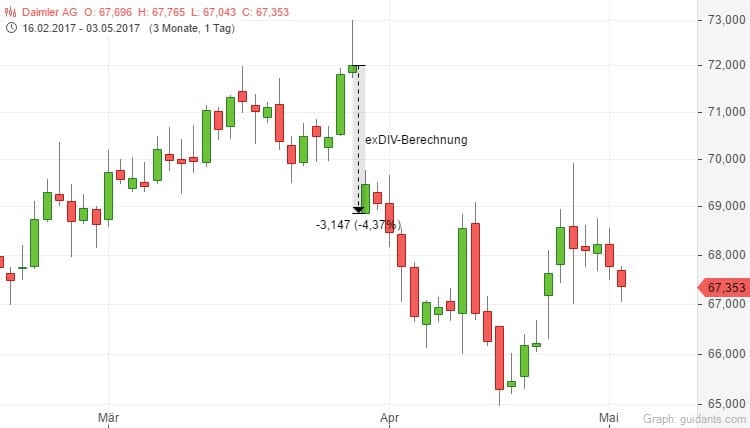 Daimlers Dividende für das Geschäftsjahr 2016 lag bei 3,25 Euro. Tatsächlich sieht man in Abb. 2 jedoch einen Sprung von nur -3,147 Euro. Wie passt das zusammen? Ganz einfach: