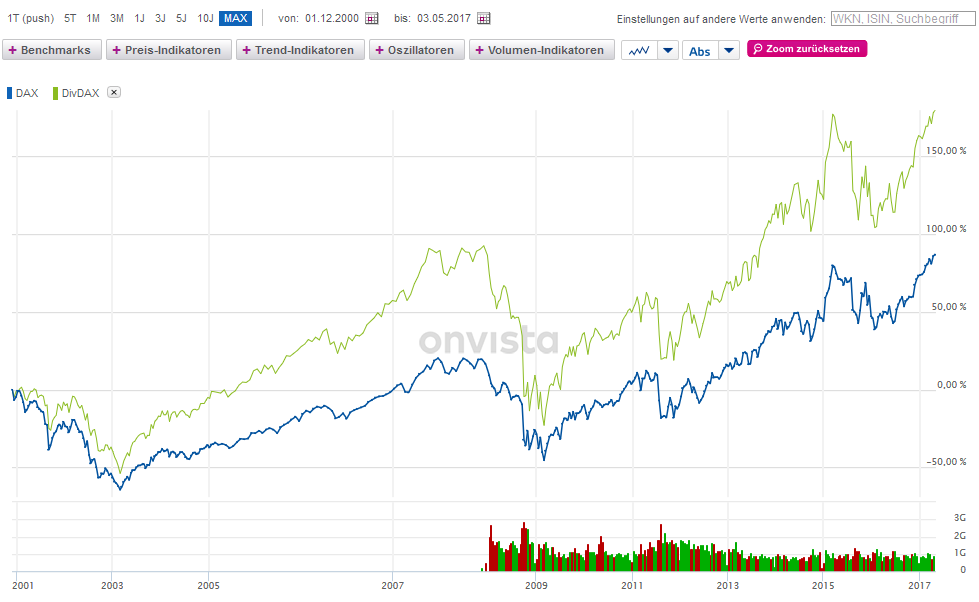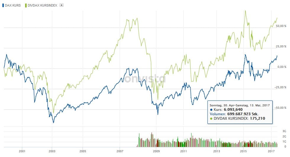 Ein direkter Vergleich der Performance des DAX und des DivDAX seit 2000 macht allerdings deutlich, dass die Top Dividendenzahler den DAX zum Teil stark übertrumpfen.