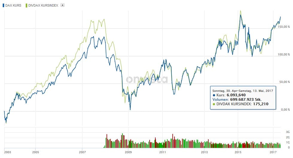 Zu beachten ist hierbei, dass der DivDAX-Kurs ebenso wie der DAX-Kurs als Performance-Index dargestellt wird und Dividenden mit in den Index eingerechnet werden. Das bedeutet: Der Dividendeninvestor, welcher 1x im Jahr eine Umschichtung zugunsten der höchsten Dividendenzahler des DAX vornimmt (wie der DivDAX es für seinen Index tut), bzw. einen ETF auf den DivDAX hält, sowie die Dividenden reinvestiert, hat den DAX deutlich geschlagen.