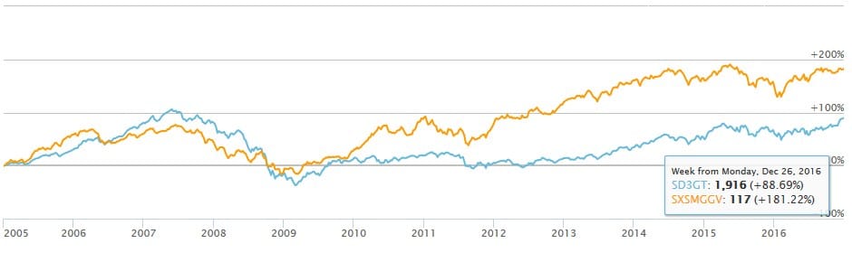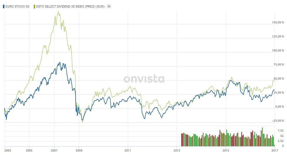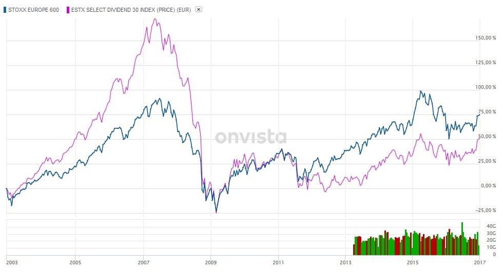 Euro STOXX (SXXGT), Euro STOXX Select Dividend 30 (SD3GT) werden Standartmäßig als Kursindex dargestellt. Bei der Betrachtung von Mai 2005 bis Mai 2017 scheinen sich die Dividendentitel tatsächlich in der Gesamtbetrachtung schlechter entwickelt zu haben, als der Gesamtmarkt. Allerdings erst nach der Finanzkrise, denn zwischen 2005 und Mitte 2007 haben die 30 Euro STOXX Dividendentitel den Gesamtindex um rund 25% übertroffen.