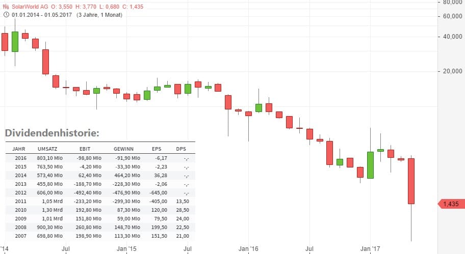 Wäre nun (ich weiß, hätte-hätte-Fahrradkette), aus welchen Gründen auch immer jemand Anfang 2009 bei einem Kurs von 1,10 Euro zugeschlagen, wäre folgendes passiert: Bis heute wäre ein Kursfeuerwerk auf ihn hereingeprasselt das seinesgleichen sucht. Plus 4.500%, im Schnitt 60% jährlich, in den letzten 8 Jahren. Interessanter noch: Wie sieht es mit der Dividende aus?