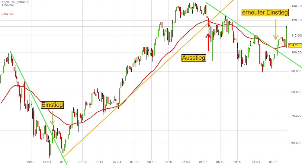 Von besonderer Bedeutung sind in dem Zusammenhang die Trendlinien. Hier ist allerdings Voraussetzung, dass der Trend eindeutig eingesetzt hat, und bereits einen zweiten signifikanten Tiefpunkt ausgebildet hat. Abb. 3 zeigt das Prinzip anhand von Apple zwischen Mitte 2012 und Ende 2016 (Wochenchart).