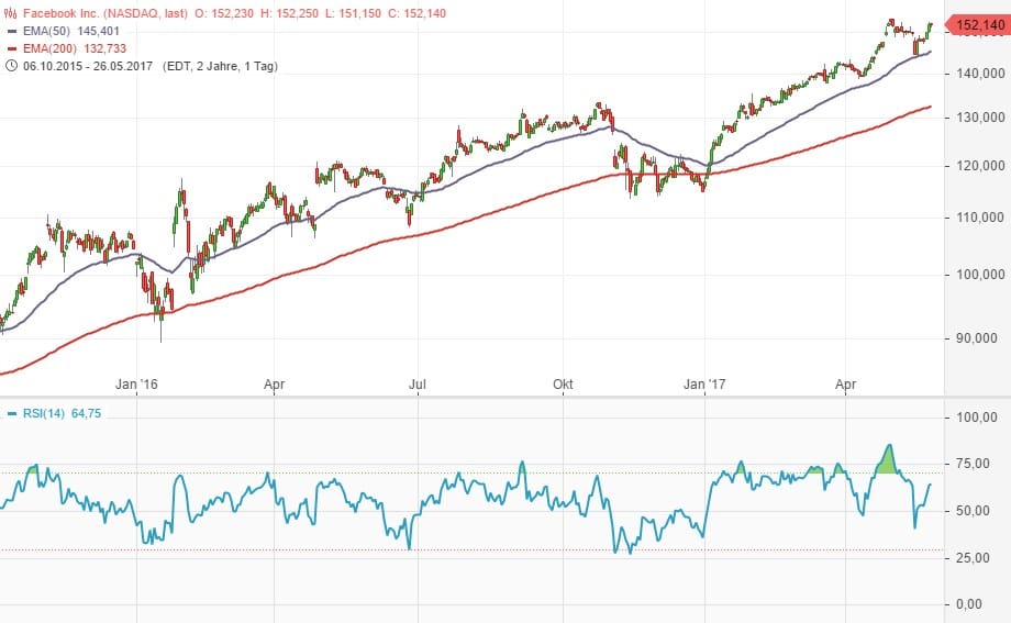 Für unsere Betrachtung in Abb. 8 sind vor allem die überverkauften Bereiche Interessant. Wir sehen eine trendstarke Aktie (Facebook). Das sieht man vor allem an der EMA50-EMA200 Konstellation. Auch hier gibt es Korrekturen. Sie sind dank RSI sehr gut zu erkennen.