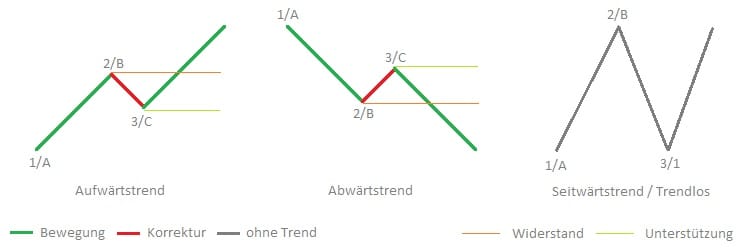In der Markttechnik wird ein Trend in Form eines 1-2-3er Musters definiert. Die folgende Erklärung basiert auf einem Aufwärtstrend, kann jedoch ebenso auf einen Abwärtstrend angewendet werden.