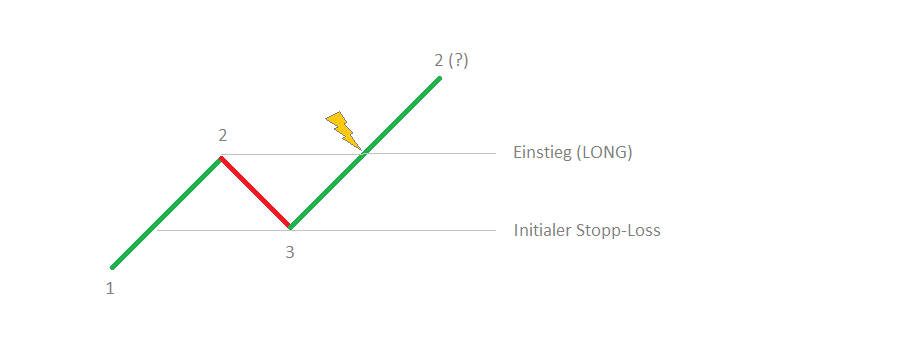 Ist ein markttechnischer Trendfolger eingestiegen, setzt er seinen initialen Stopp-Loss kurz unter den vorigen Punkt 3. Denn genau dort würde der Trend gebrochen, sofern der Preis bis dahin zurückgeht.